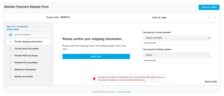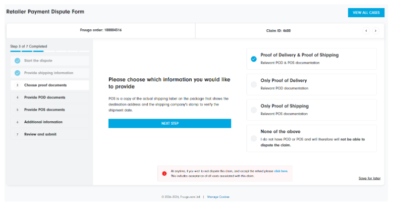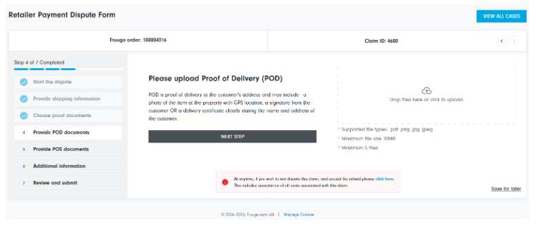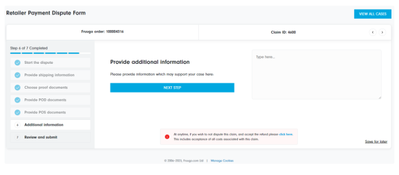 您可以随时选择在屏幕右上角的“查看所有案例”以离开流程,该选项将打开需要处理的所有未解决纠纷的完整列表。