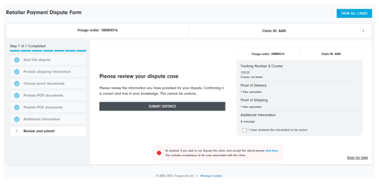 在提交辩护后,将触发一封电子邮件,并显示一个屏幕,确认对索赔的争议。