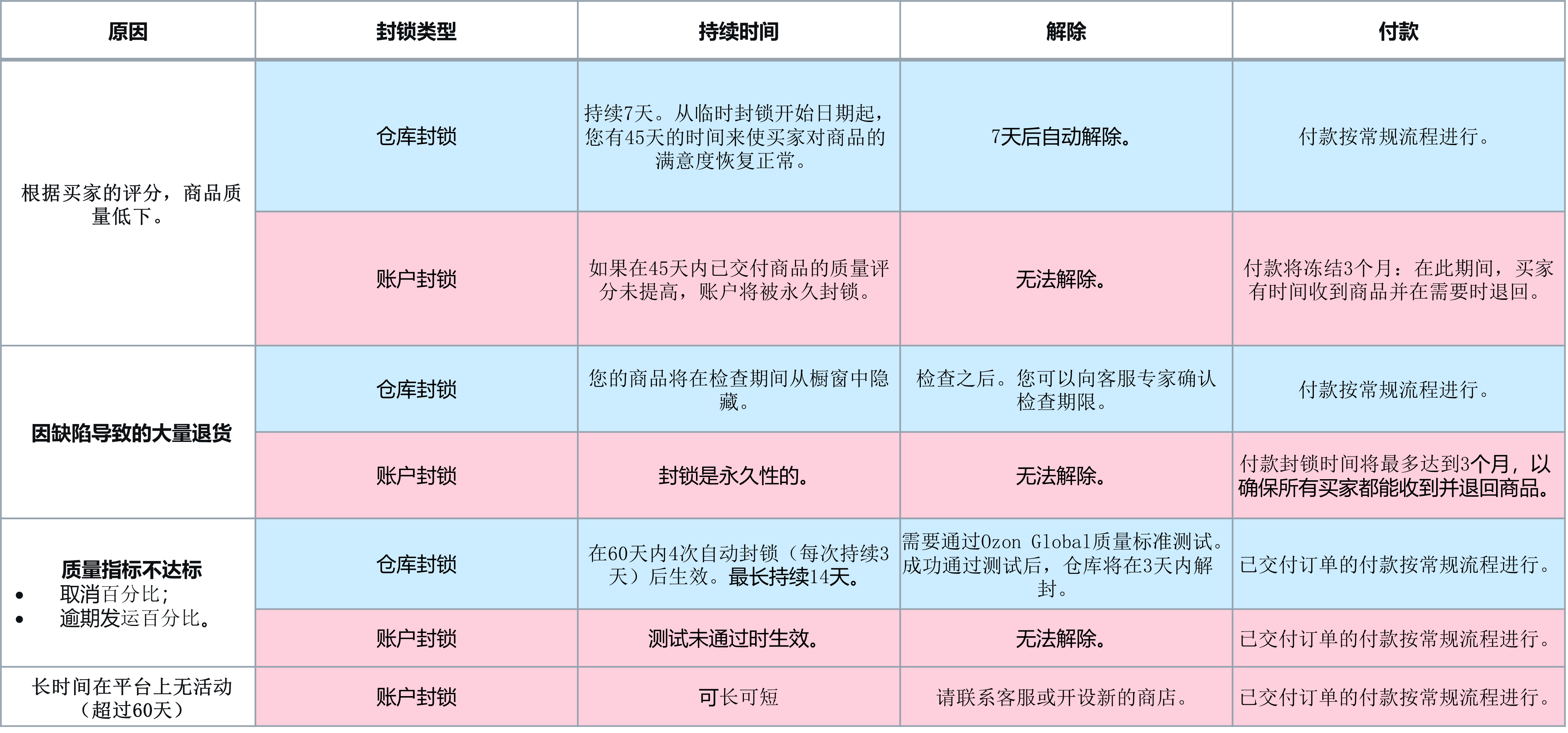 方便起见,我们在下表中汇总了最常见的封锁原因,以及有关其持续时间和后果的信息。