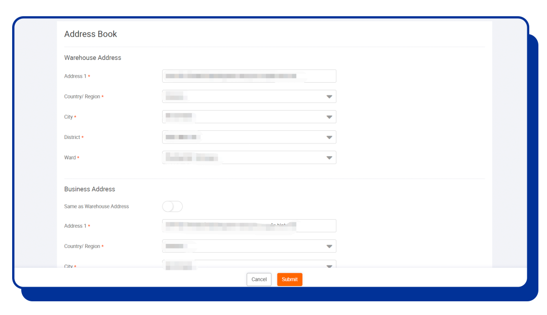 4、填写仓库信息和个人/企业地址信息