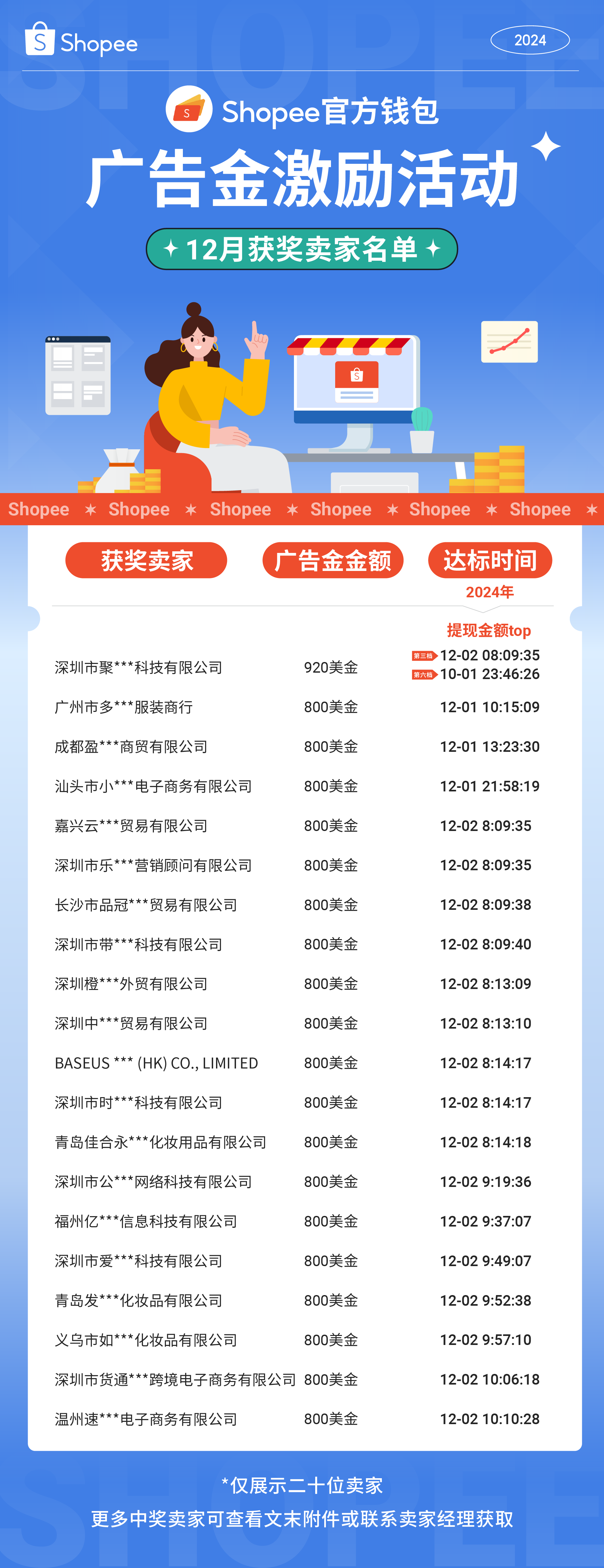 您好!Shopee官方钱包2024年12月广告金活动获奖名单已重磅出炉!恭喜以下卖家在12月使用Shopee官方钱包进行提现、使用提前回款服务进行融资,并参与了广告金激励活动,赢取了Shopee广告金大奖!Shopee官方钱包助力卖家们在大促期间爆单更得心应手!