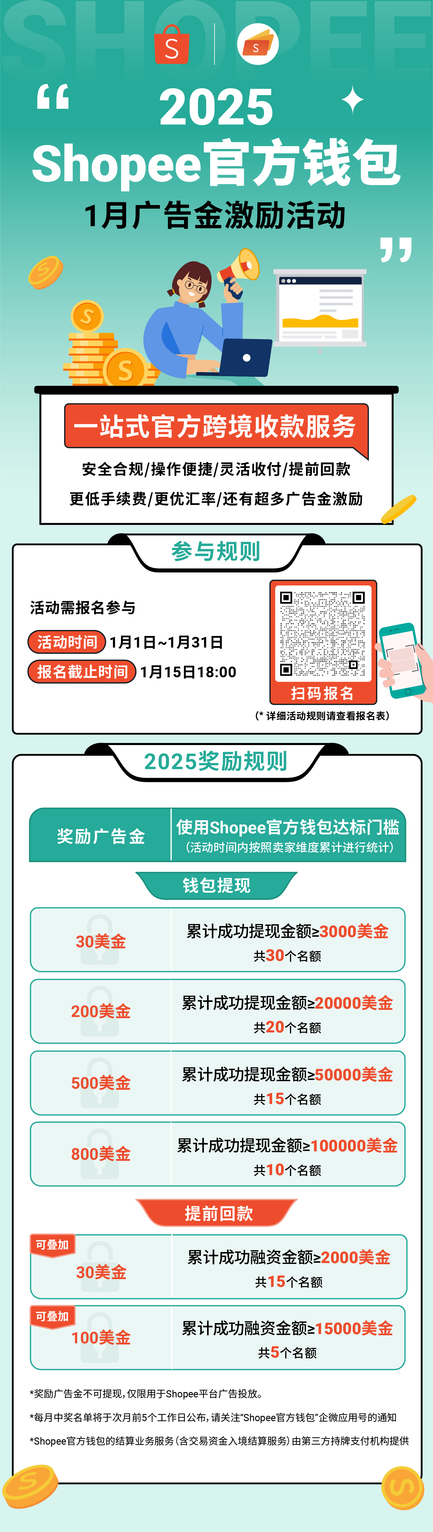 只要使用Shopee官方钱包进行收款/提现、或使用钱包提前回款服务进行融资,每个月都可以报名参与奖励活动,多档广告金激励还可叠加!提现越多省越多手续费,提现越多赢越多广告金!提前回款服务缩短账期,融资越多赢越多广告金!每个月最高可获得900美金的广告金,火力全开冲刺爆单!(赠送名额有限,先到先得)