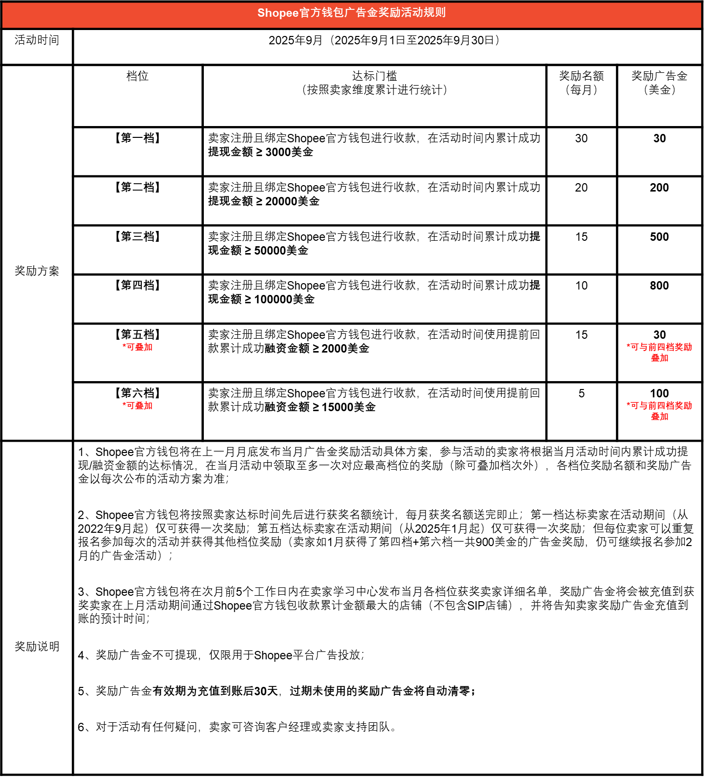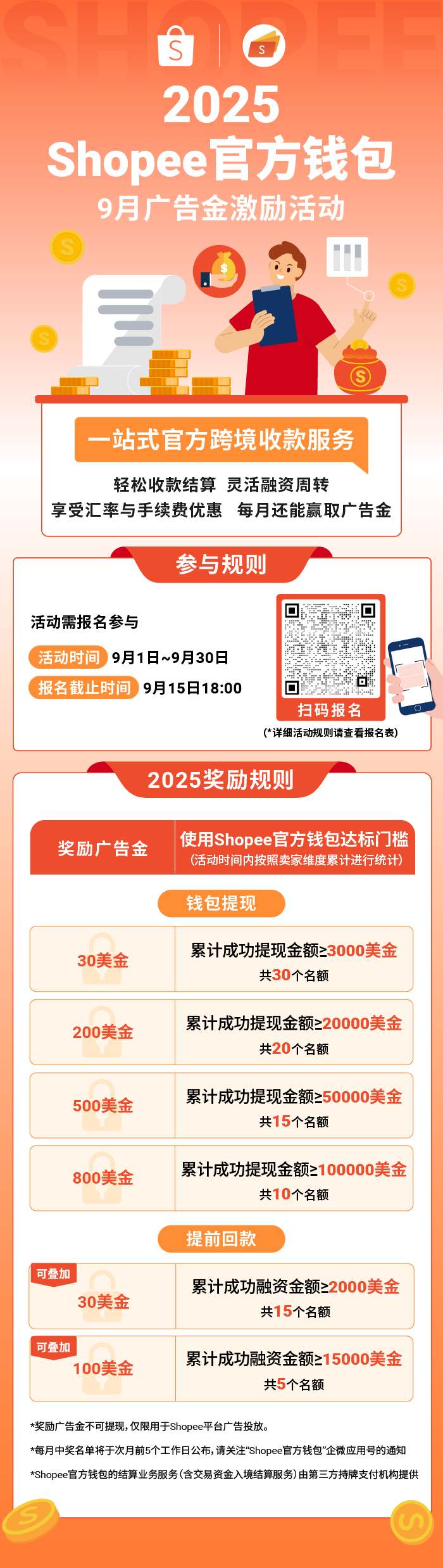 您好!好消息!2025年9月Shopee官方钱包广告金激励活动已上线!继续奖励广告金!提现/融资越多奖励越多!不仅月月可参加,不同档次奖励还可叠加拿!开通Shopee官方钱包并在2025年9月15日18:00之前填写活动报名表即可参与奖励活动。
