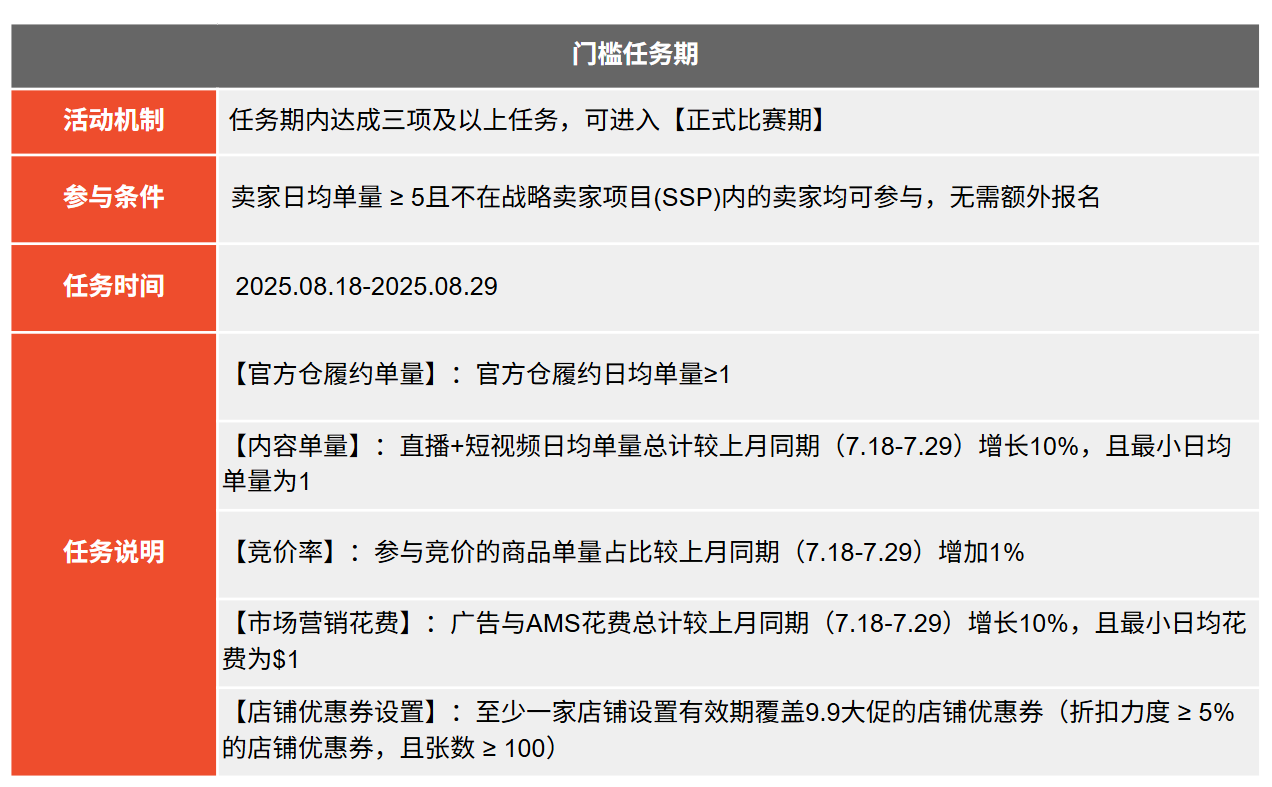 2025年8月18日至2025年8月29日为本次旺季激励大赛的门槛任务期,期间符合条件的卖家只需达成以下任意3个任务即可进入旺季激励正式比赛期,无需额外报名。