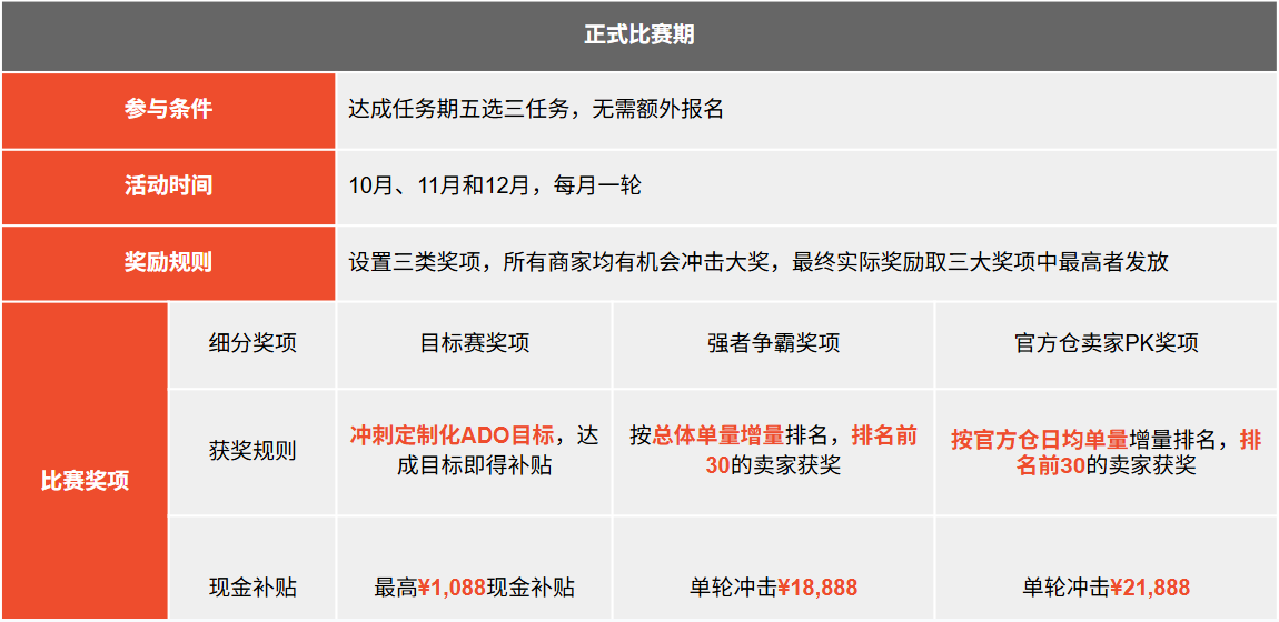 符合条件的卖家在规定时间内完成门槛任务期挑战,即可获得正式比赛期的参赛资格,参与10月、11月和12月连续三轮的旺季比拼。只要达成单量目标或排名靠前,就有机会获得最高单轮21888元人民币!三轮征程,三次机遇;步步为赢,奖池触手可及!