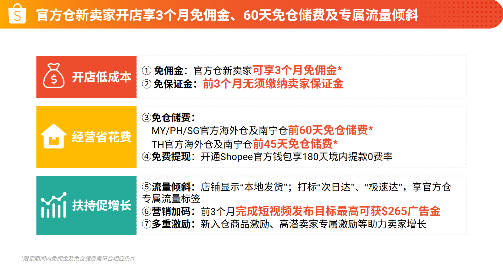 除以上激励项目外,Shopee还会为您提供开店、仓储、清关货运、支付、品牌认证等方面的支持,详情请咨询您的客户经理。