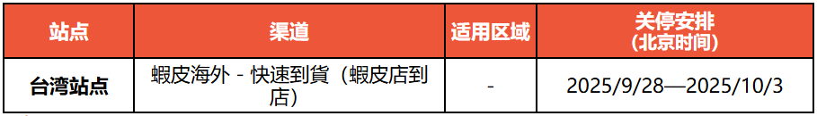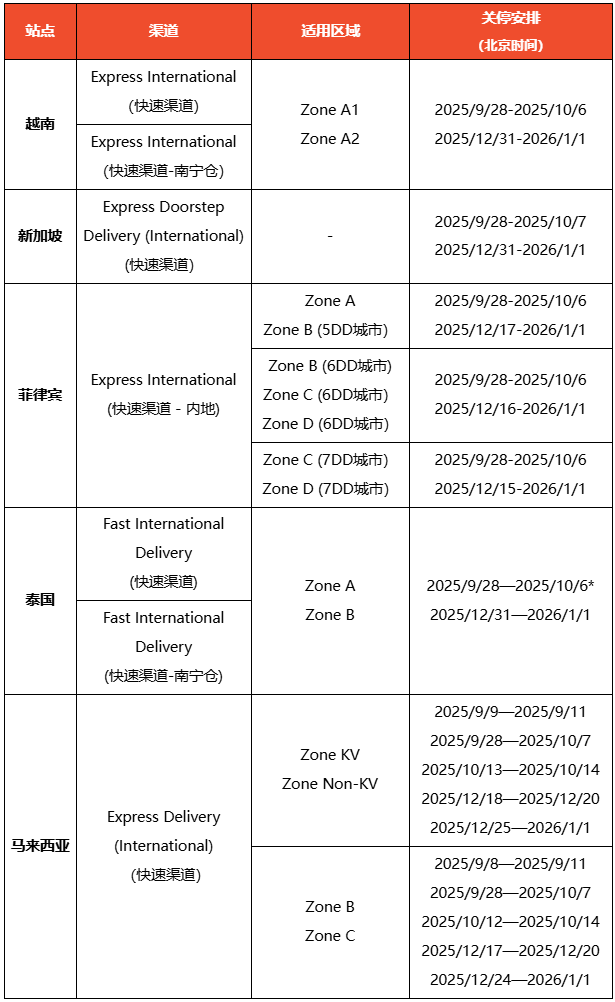 您好!受中国和当地市场节假日影响,为帮助您更好地进行相关店铺或商品的物流运输调整,Shopee SLS-N日达-国际快速物流渠道会进行短期关停调整,2025下半年具体安排如下表所示。