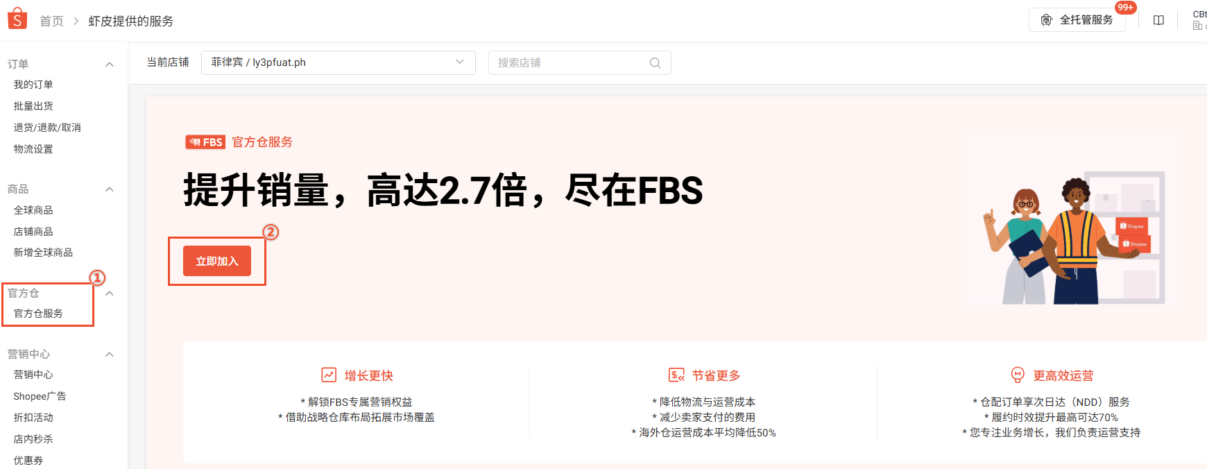 若卖家已有店铺开通其他官方仓/南宁仓,该版块【立即加入】按键会显示灰色无法点击,那您可以按以下流程进行开通