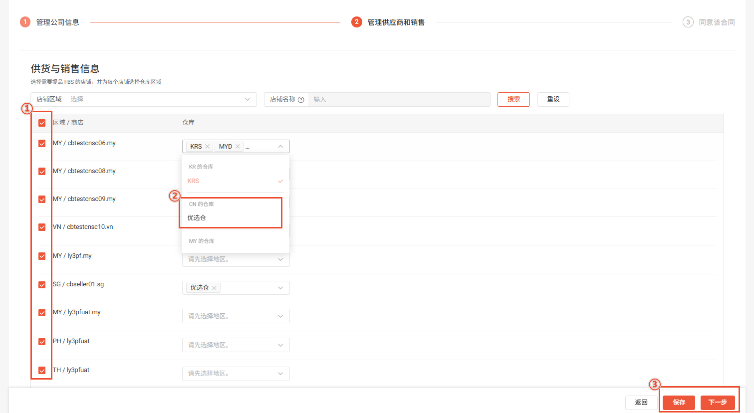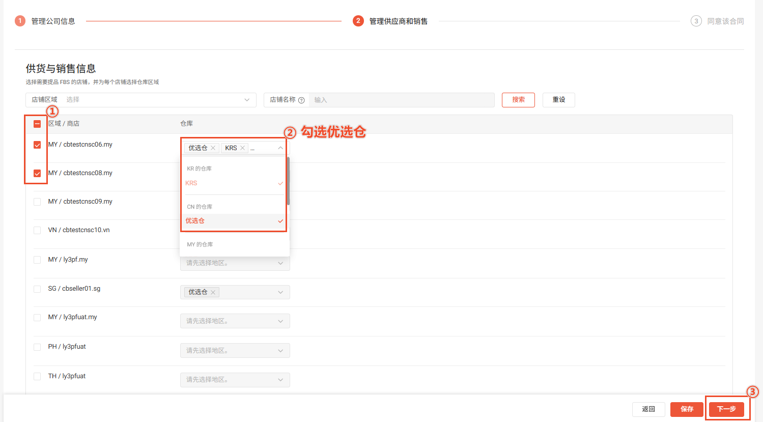 接下来进入到供货与销售信息页面,您需要勾选您想开通优选仓的店铺,下拉菜单选择【优选仓】,点击【保存】并进入【下一步】