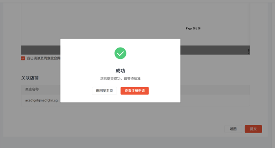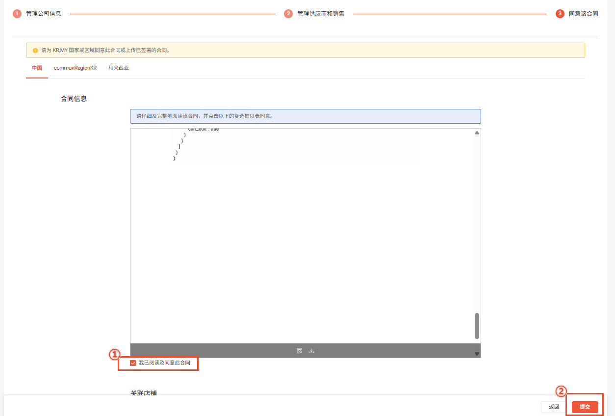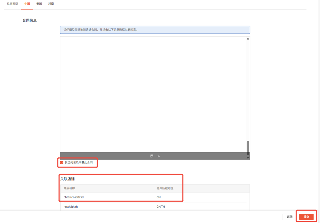 查阅合同的全部内容,勾选【我已阅读并同意本合同】,确认关联店铺信息无误后,点击【提交】完成操作。