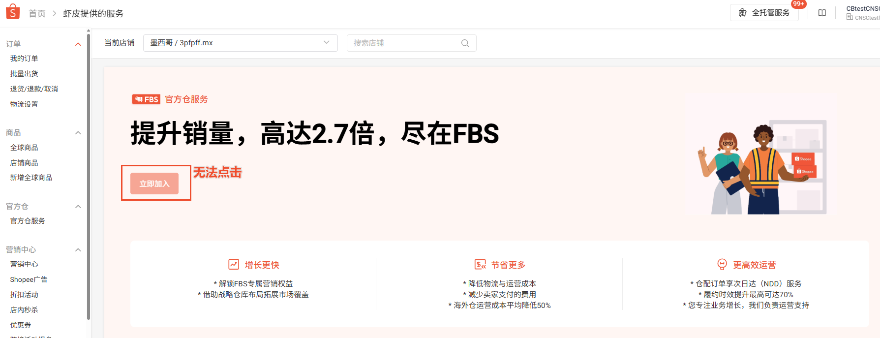 若您的店铺已开通其他海外仓或南宁仓,该版块【立即加入】按键会显示灰色无法点击,请看本文【二、已入驻其他官方仓的卖家】。