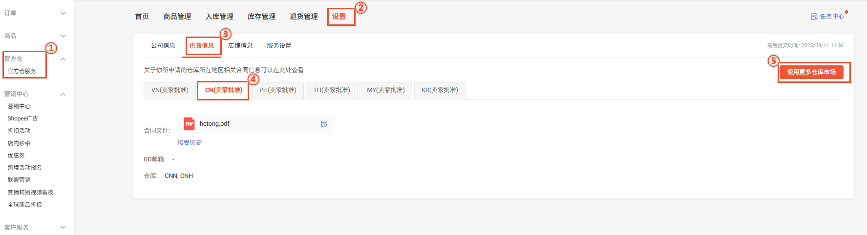 您可以切换已开通官方仓的店铺,点击【官方仓服务设置供货信息CN(卖家批准)】,此时再点击右上角的【使用更多仓库市场】按钮
