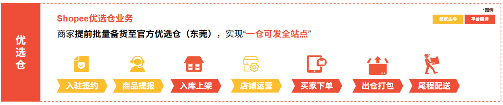 Shopee官方优选仓业务,卖家需提前批量备货至官方优选仓(东莞),便可实现“一仓可发全站点”;买家订单确认后,系统自动安排优选仓在24小时内发货,后续跨境物流全流程由Shopee负责,让商家专注销售,省心省力。