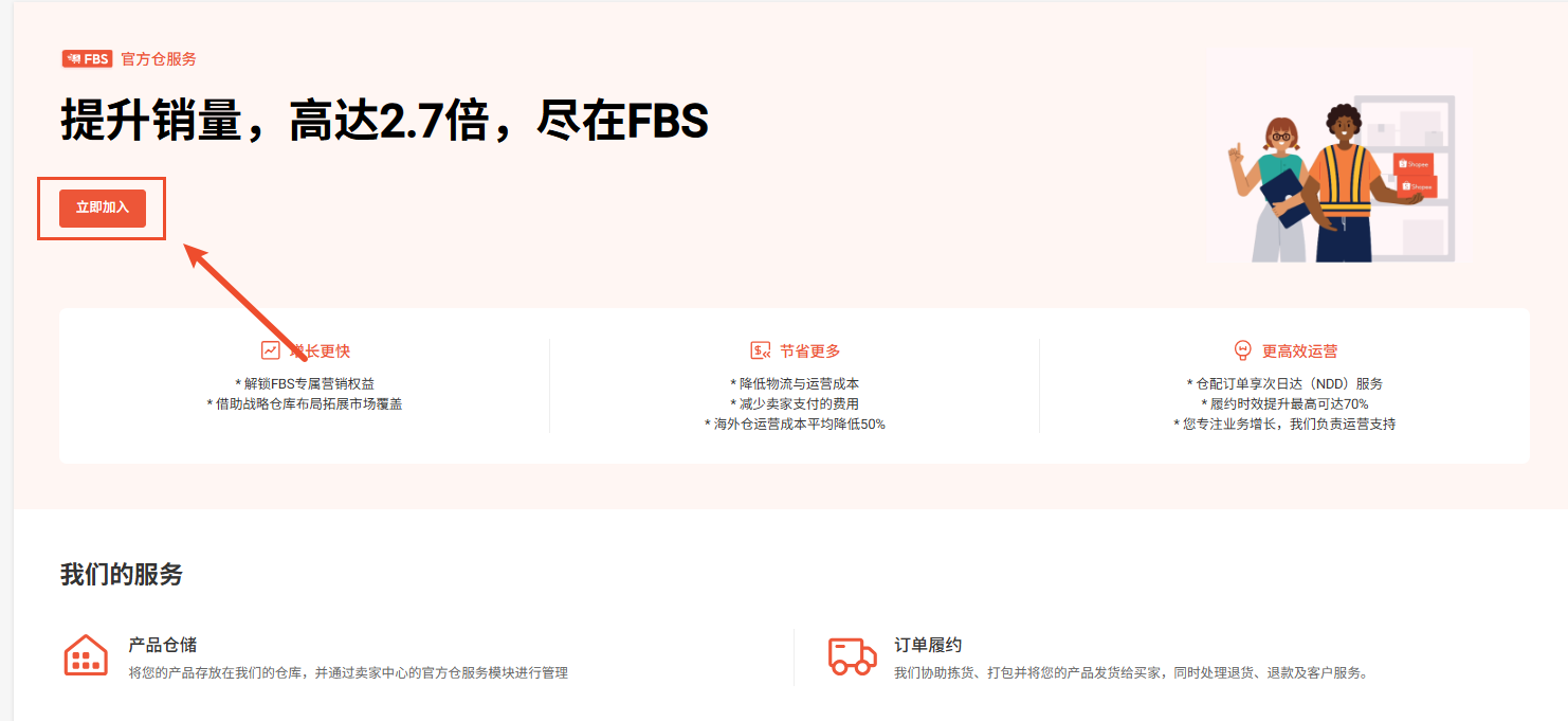 首先,进入【进入中国卖家中心 官方仓官方仓服务】页面,然后点击【立即加入】开始海外仓入驻签约。