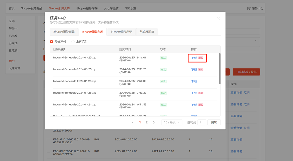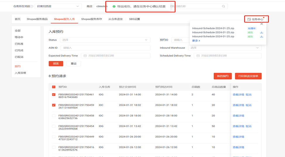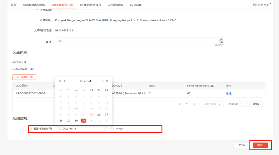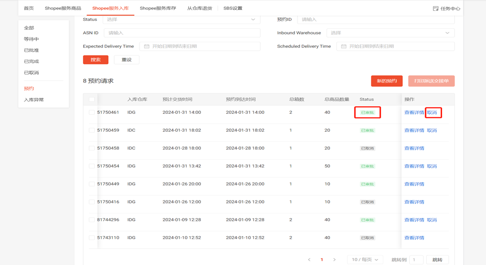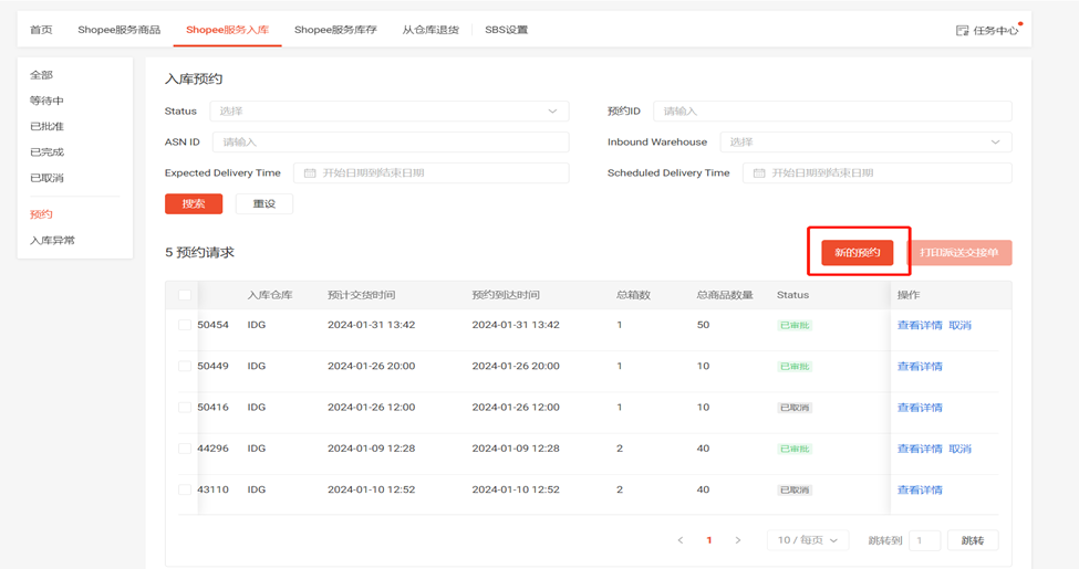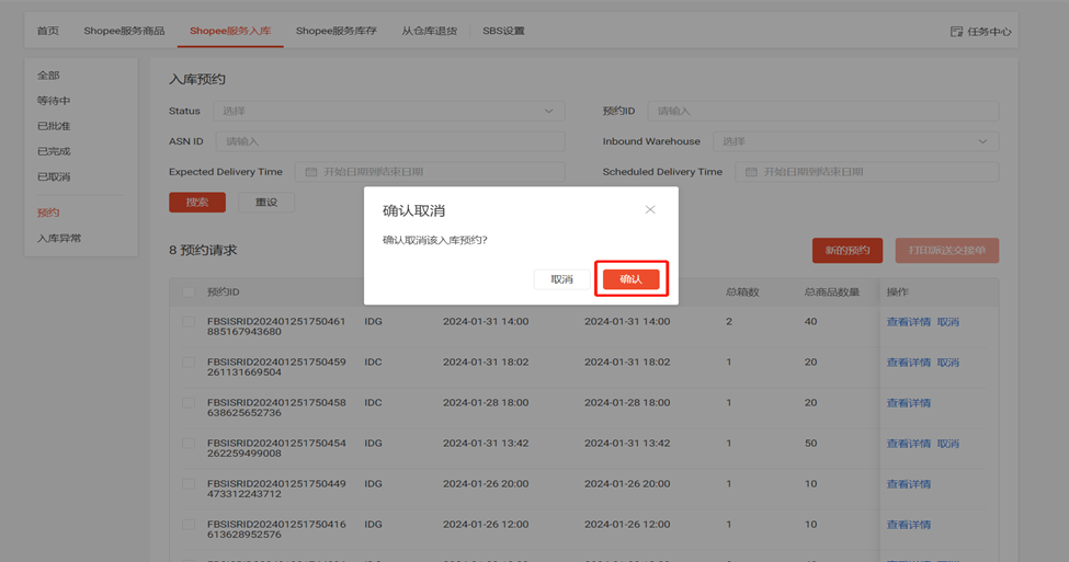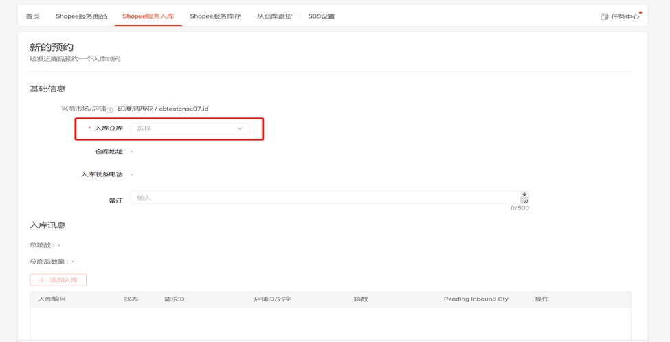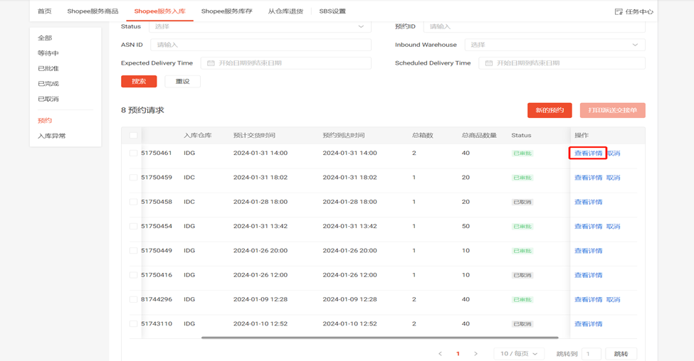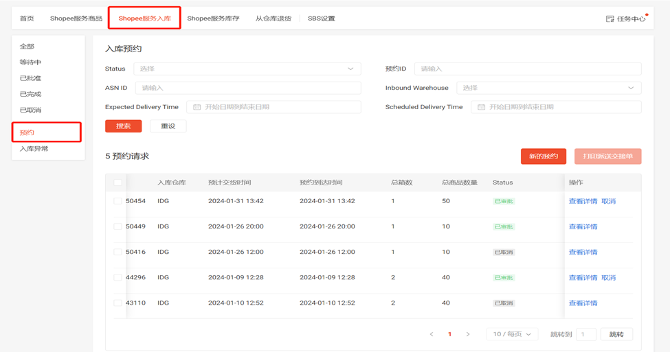 (1)点击SBS模块中的 “Shopee服务入库”板块选择左侧“预约”一栏