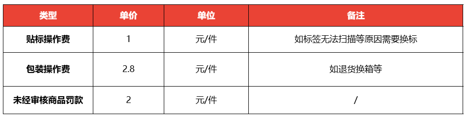异常件处理收费情形:商品标签损坏、无法扫描,商品标签贴错,箱标签不正确、损坏,仓库将代为处理,并按收费标准(详见此处)收取操作费用。