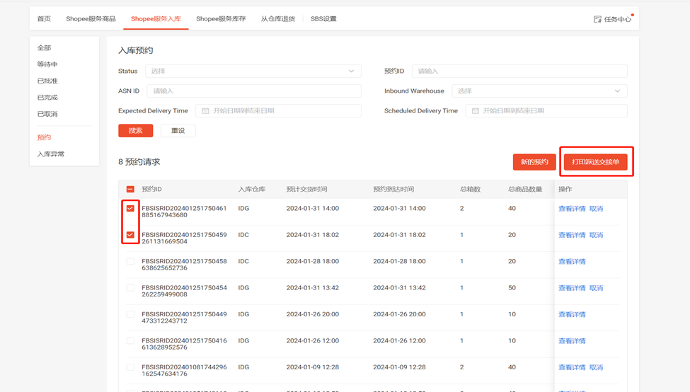 (1)勾选需要交接单的预约请求,点击“打印派送交接单”