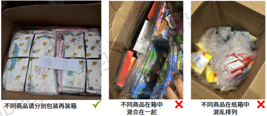建议一箱只装一种商品。若每个箱子内有多种商品,不同商品请务必分别包装,以便于分拣,且务必保证一种商品不得与其他商品混装在超过3个箱子中,以免入库环节增加数量差异风险。
