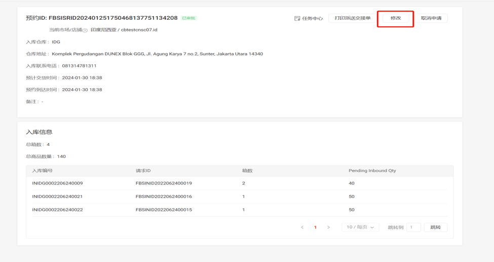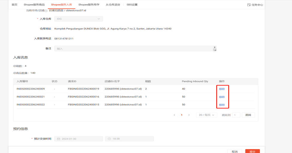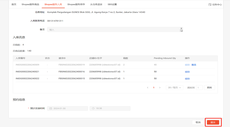 备注:只有“已发货”的入库申请才可以创建预约请求