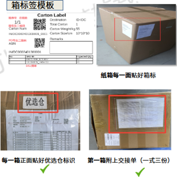 3) 交接单:须打印一式三份交接单装在信封里并附在**第一箱子上,交接单可在PO预约后在后台下载打印**(交接单必须有准确的箱子数量/产品数量,如无则将被拒收)