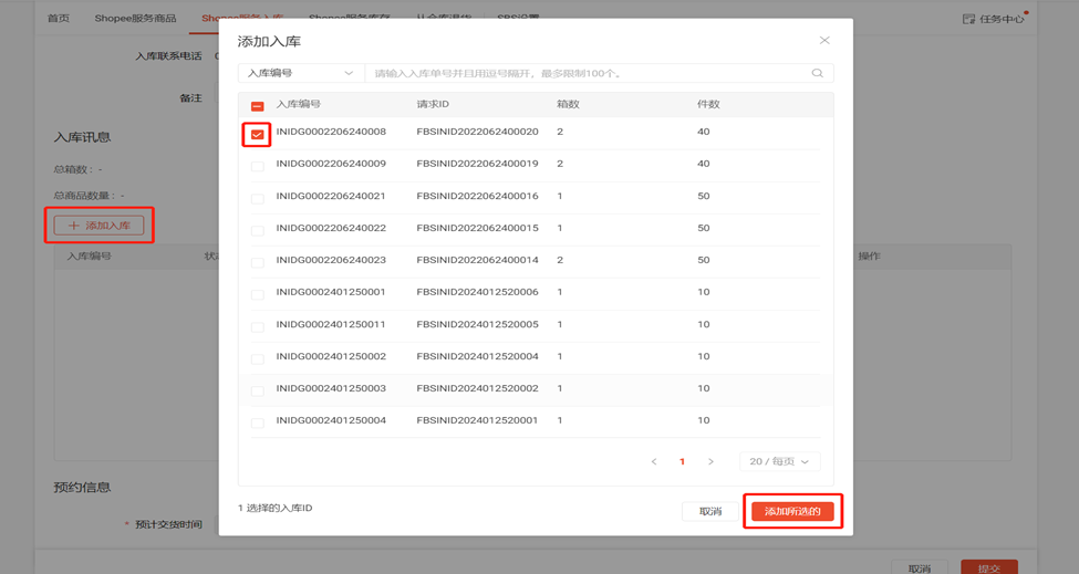 (2)点击“添加入库”,勾选相应的入库编号,点击“添加所选的”