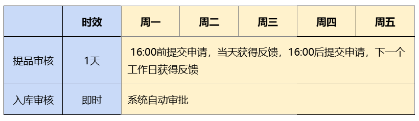 商品提报和入库申请审核周期不一致,为两个独立步骤。即新商品,需要先完成商品提报,再申请入库。