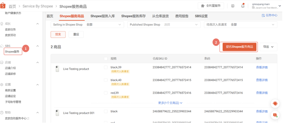 在【中国卖家中心SBSShopee服务】页面【提名Shopee服务商品】,并进行入库。