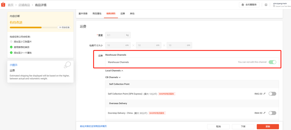进入【店铺商品商品详情】页面,您可以看到【运费】显示【Warehouse Channels】的本地渠道(您无法编辑),然后点击【更新】。