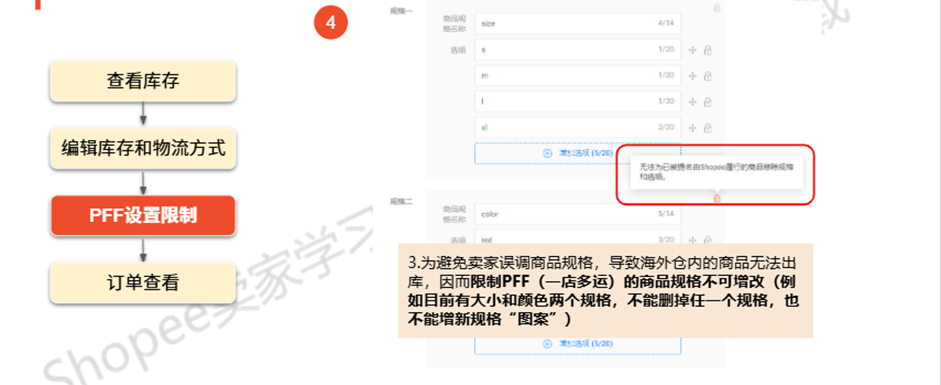 为避免卖家误调商品规格,导致海外仓内的商品无法出库,因而限制PFF(一店多运)的商品规格不可增改(例如目前有大小和颜色两个规格,不能删掉任一个规格,也不能增新规格“图案”) 。