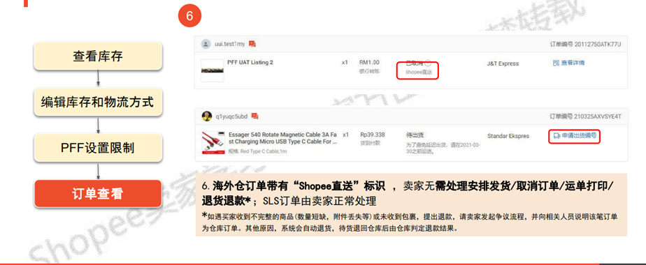 海外仓订单带有“Shopee直送”标识 ,卖家无需处理安排发货/取消订单/运单打印/ 退货退款;SLS订单由卖家正常处理。