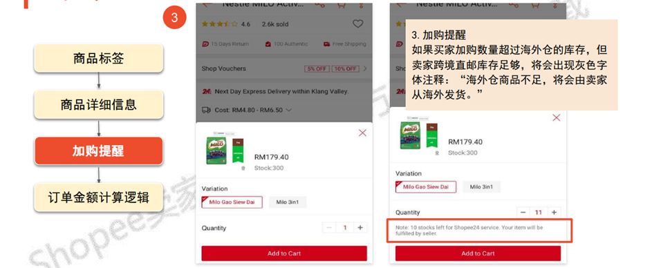 如果买家加购数量超过海外仓的库存,但卖家跨境直邮库存足够,将会出现灰色字体注释:“海外仓商品不足,将会由卖家从海外发货。”