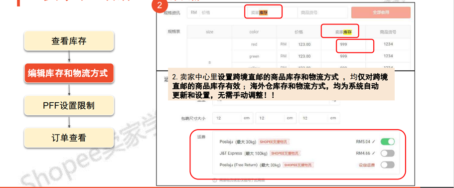 卖家中心里设置跨境直邮的商品库存和物流方式 ,均仅对跨境直邮的商品库存有效 ;海外仓库存和物流方式,均为系统自动更新和设置,无需手动调整!!