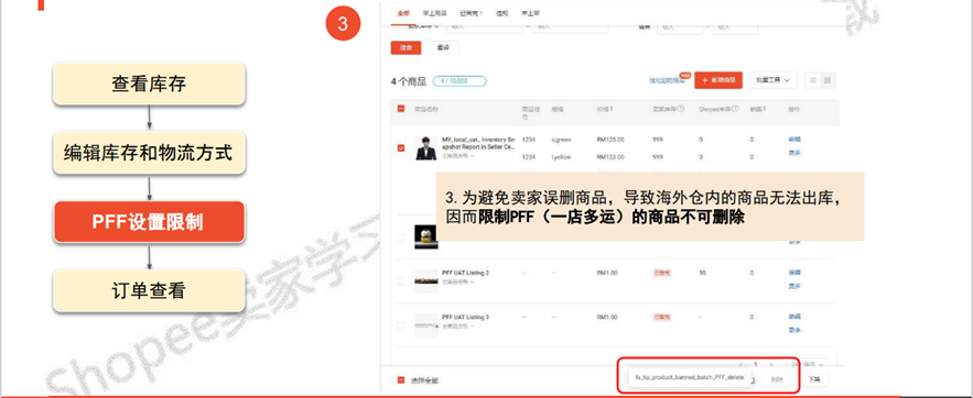 为避免卖家误删商品,导致海外仓内的商品无法出库, 因而限制PFF(一店多运)的商品不可删除。