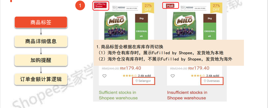 (1)海外仓有库存时,展示Fufilled by Shopee,发货地为本地;