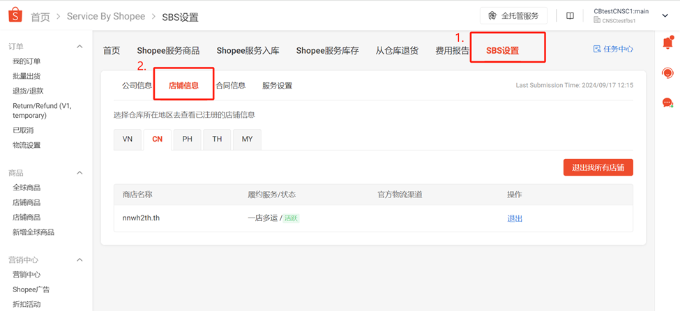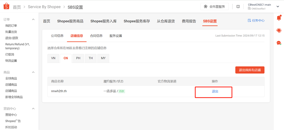 选择店铺的仓库所在地区,确认店铺名称,点击【退出】