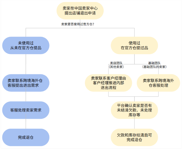 对于曾使用过官方仓服务(有过提品)和从未使用过官方仓服务(从未提品)**的卖家(基础卖家除外),其退仓操作流程各不相同。