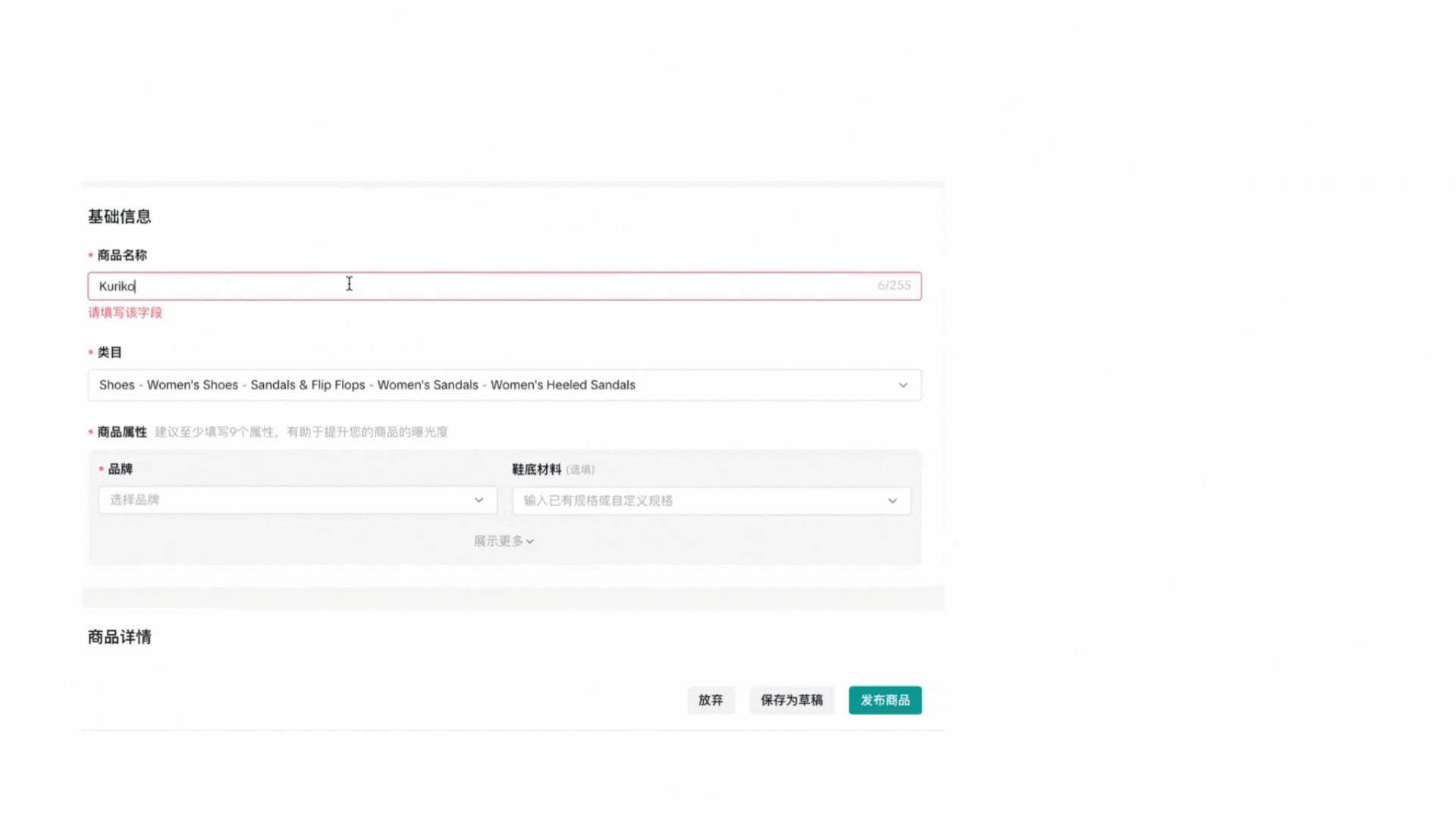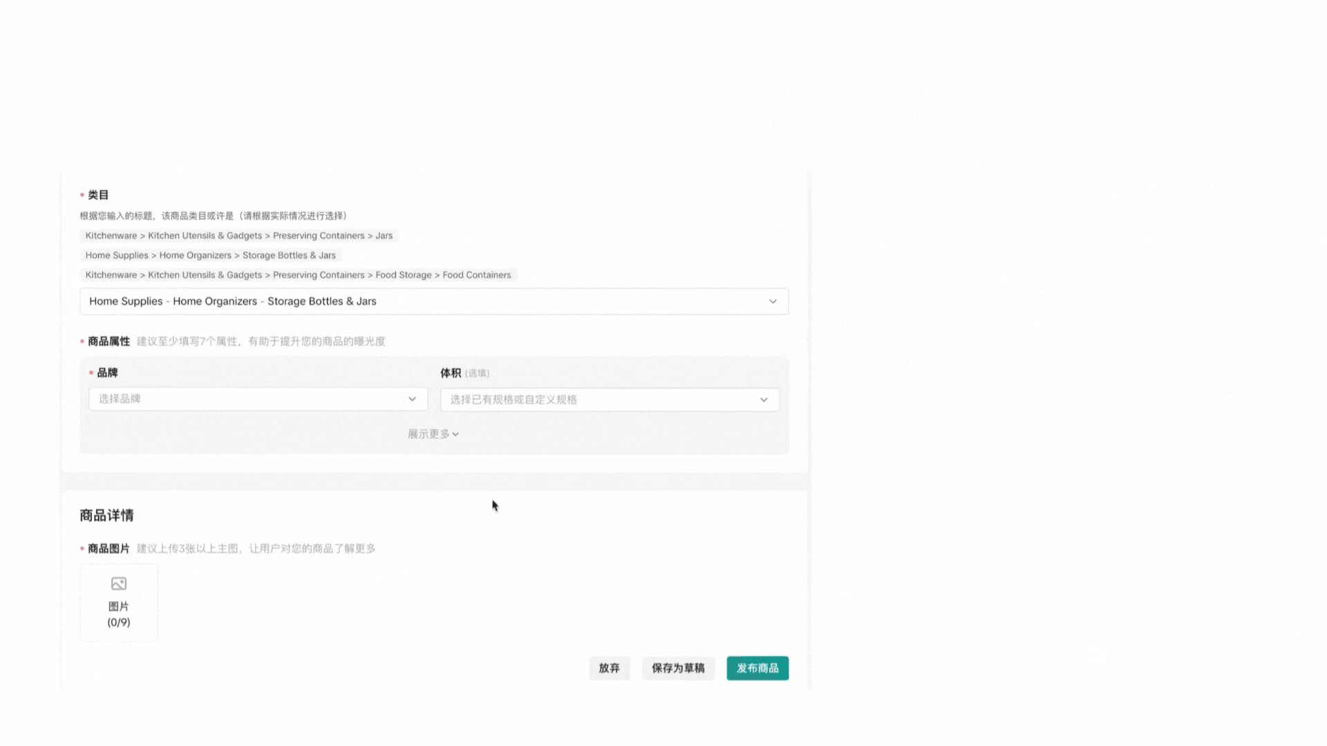 补充产品属性(如颜色、尺寸、品牌等),帮助您的商品在对应类目中脱颖而出。