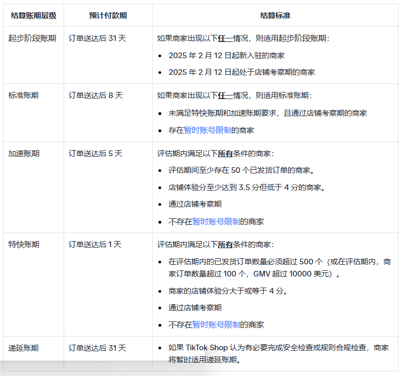 特快账期:TikTok Shop支持的最快结算账期。特快账期依店铺表现而定。
