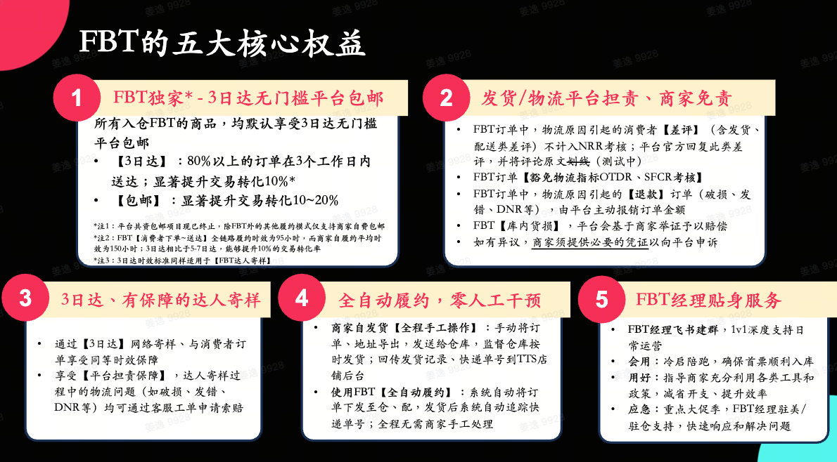 从商家的反馈中来看,FBT在商家眼里,也不仅仅是物流服务。除了物流本身之外,商家对免责、包邮、FBT经理的支持也同等重视。