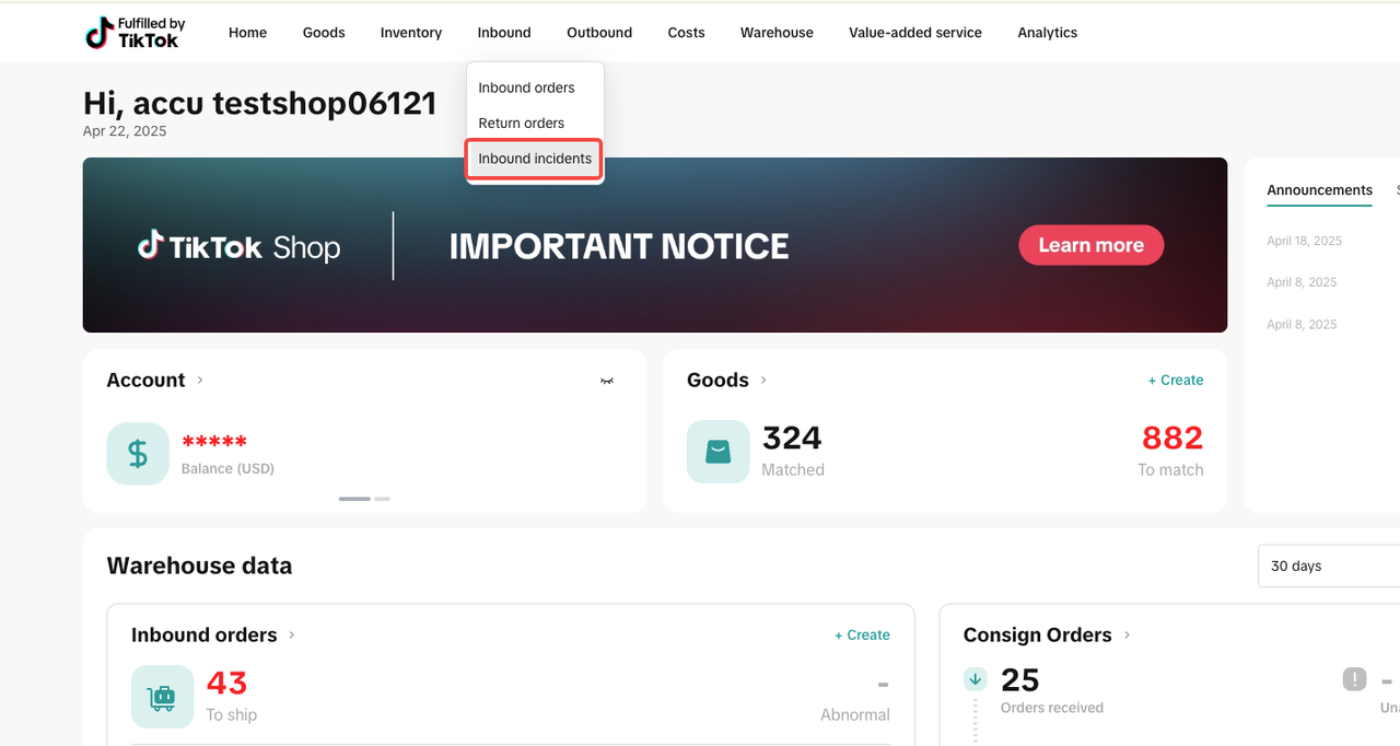 当FBT仓库收货后,如发现货品有异常(如产品条码错误、产品破损、产品到仓数量错误、箱唛缺失等),预约异常(为预约送仓、预约未送仓、延迟取消预约等),分仓异常(严重多送or短缺、放弃送仓等)会在FBT系统- inbound- inbound incidents中发起异常工单。商家需要及时在inbound incidents中查看和确认如何处理异常货品,否则该货品将无法入仓、被退回商家。