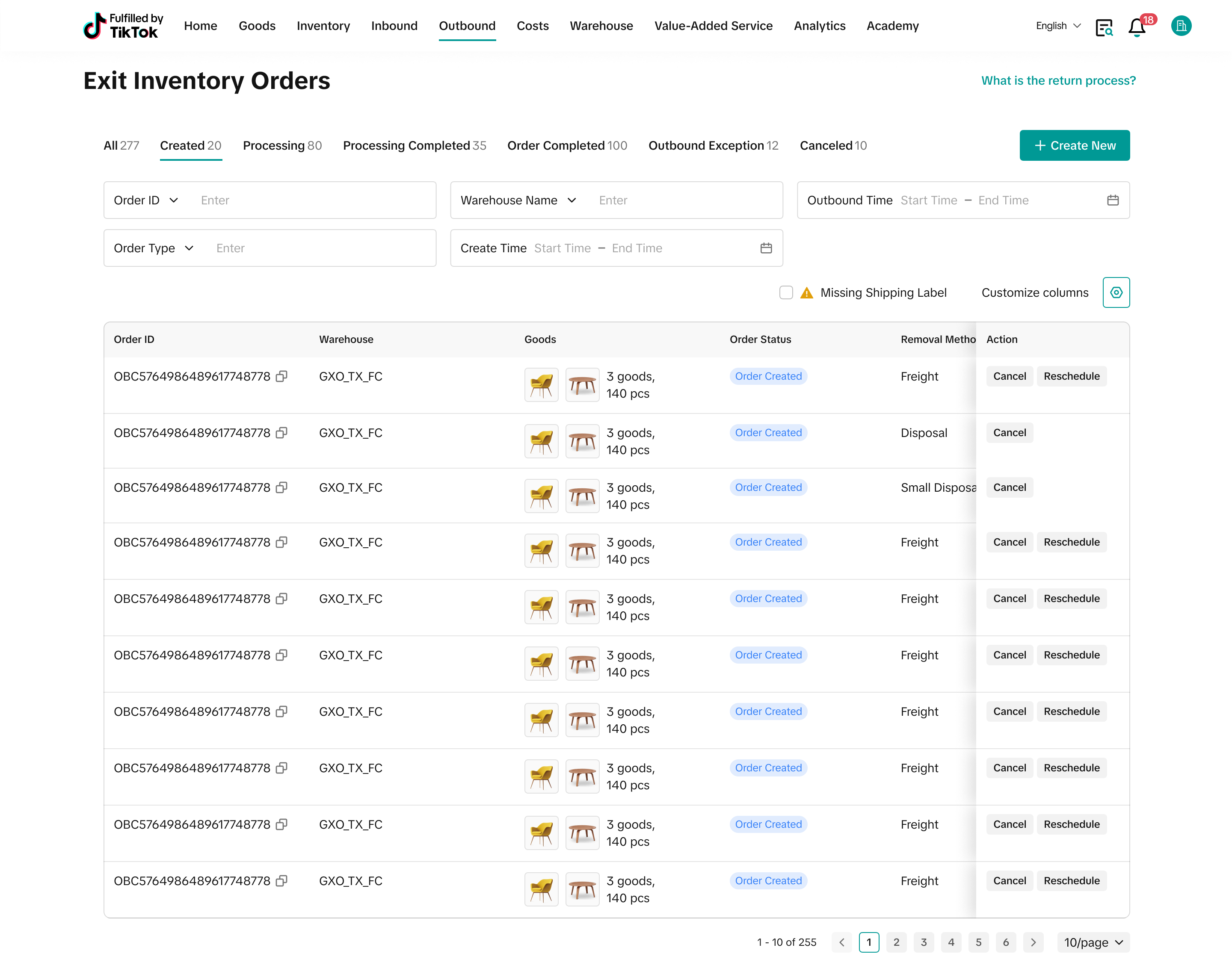 小包快递退货或销毁:对于“Small Parcel 小件包裹”和“Disposal销毁”方式,仓储费在运输状态更改为“Ready to Ship”时停止计算。