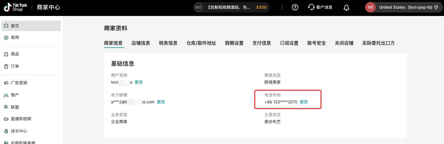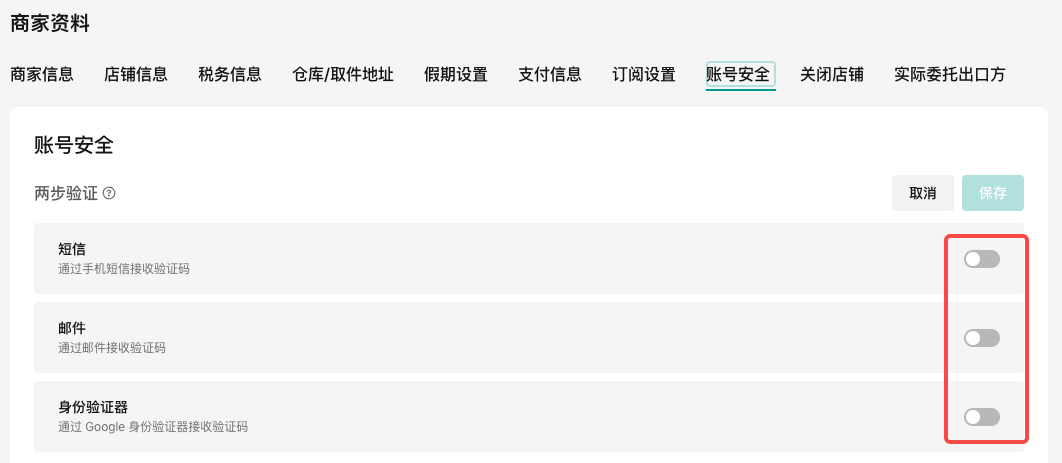 提示:如果是短信验证,可以提前在商家信息板块添加手机号码,此步骤可能需要完成邮箱验证。