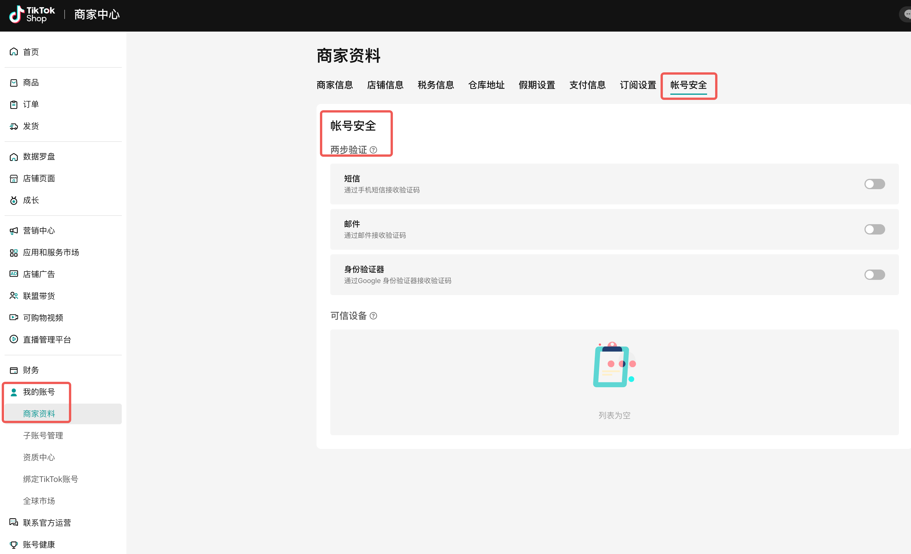 点击商家中心左下方图标,进入我的账号 商家资料 账户信息 账号安全,启用两步验证,以获得额外保护。
