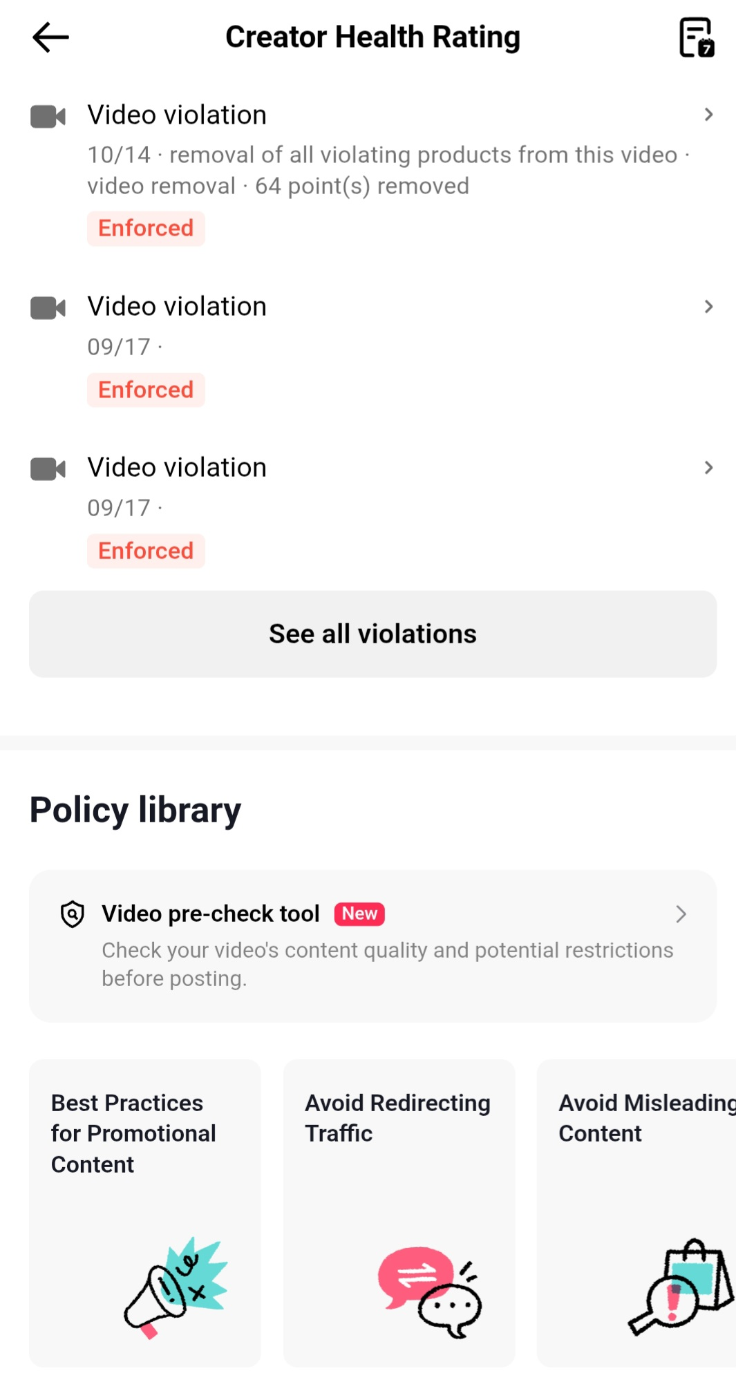 在TikTok Shop达人中心内,滚动至屏幕底部,然后点击 “达人健康分”