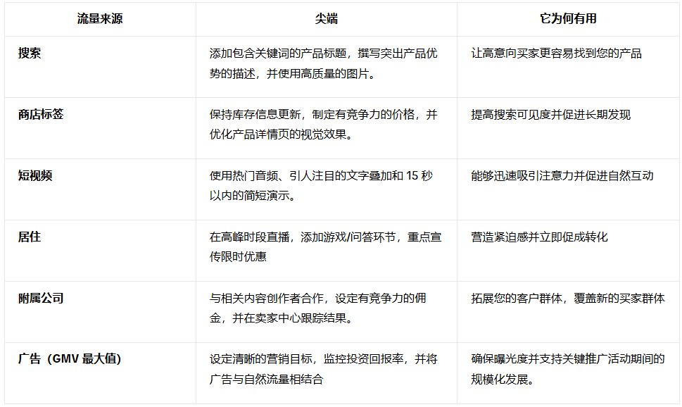 最后提示Tokopedia TikTok Shop 上的每种流量来源都扮演着不同的角色——有些带来即时转化,有些则有助于建立长期的品牌曝光。关键在于平衡:结合搜索和“商店”标签页提升曝光度,利用短视频和直播提升互动率,并通过联盟营销和广告实现规模化增长。