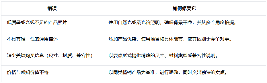 即使是精心制作的产品,如果产品信息发布不当,也会损失销量。以下是一些常见的、影响巨大的错误,需要格外注意,以及相应的解决方法: