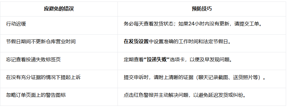 物流可能并非总是完美无缺,但借助卖家中心的合适工具,您可以快速解决大多数问题并避免处罚。保持积极主动,每日监控订单,并在必要时使用工单或申诉功能。