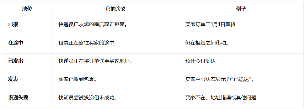 每笔订单都有一个发货状态,显示包裹在配送过程中的位置。了解这些更新有助于您避免违反服务水平协议 (SLA)。