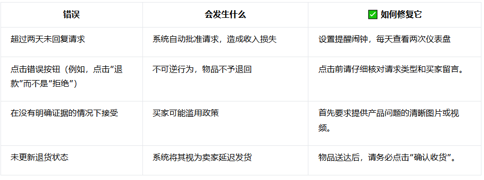 即使是售后请求处理中的一个小错误,也可能导致自动批准的退款、收入损失或买家不满。以下是一些常见错误以及如何避免这些错误: