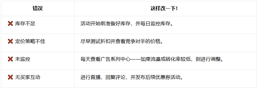 即使是经验丰富的卖家,在推广活动中也可能出现失误——但好消息是,这些错误很容易纠正。以下是卖家面临的最常见问题以及如何避免这些问题: